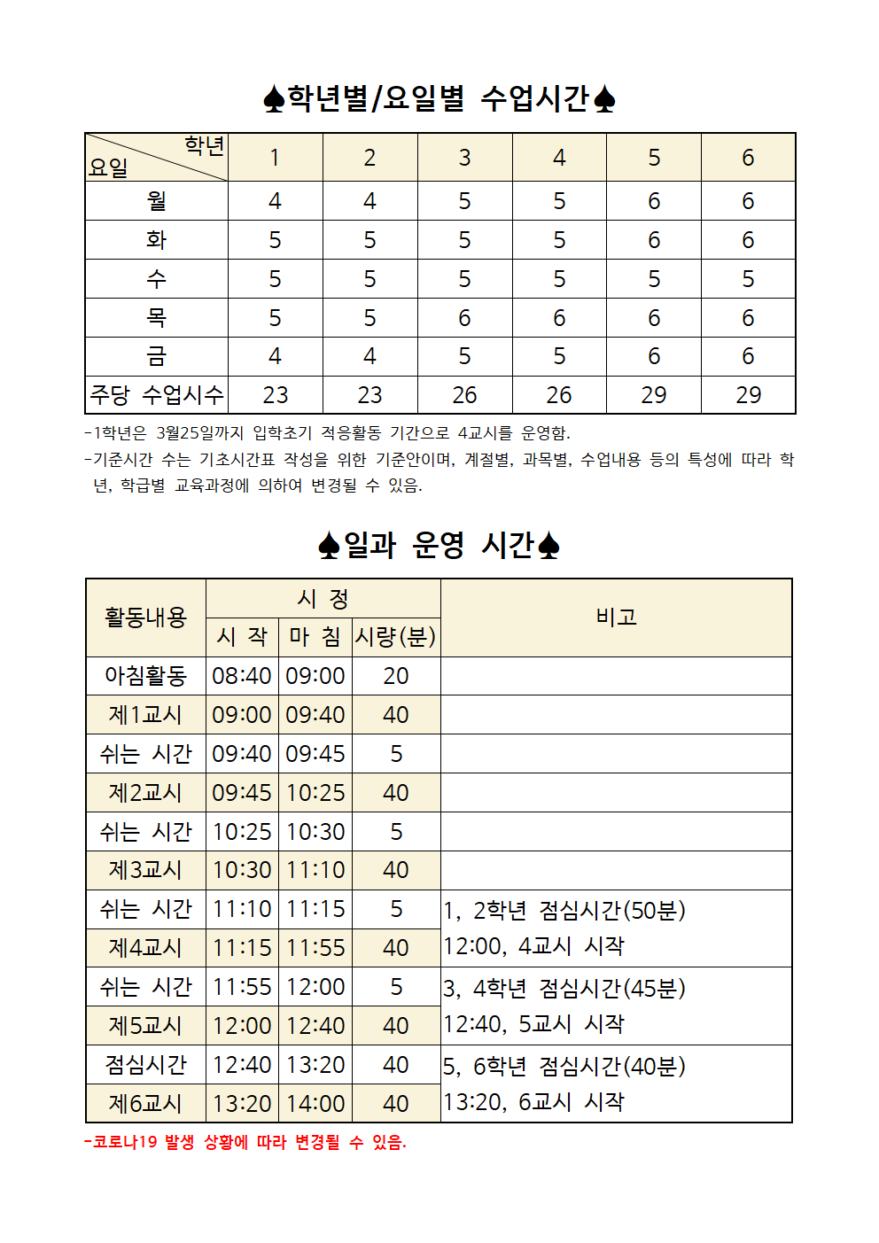 2022학년도 일과운영 시간 안내