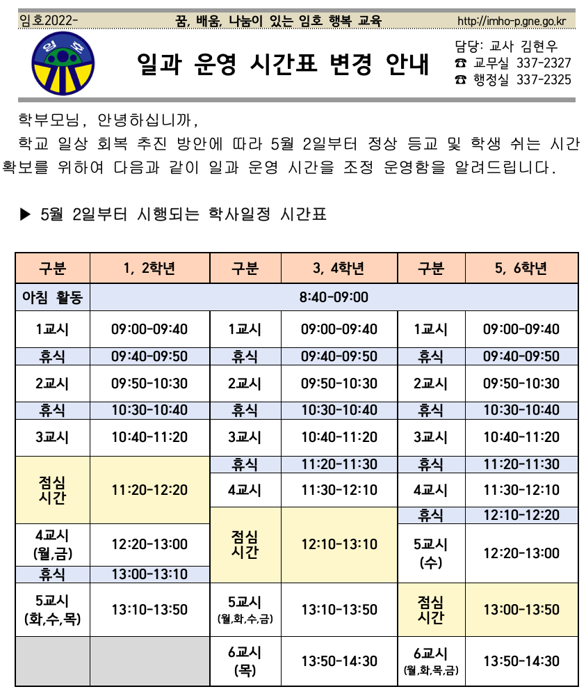 2022. 일과 운영 시간표_2022.5.2.(월) 시행